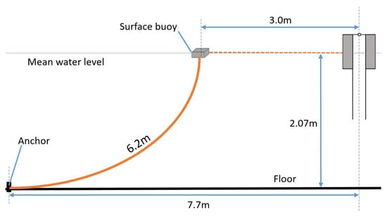 The devices were moored using a 3-point mooring arrangement of the catenary type with 120 degrees between any two mooring lines. There were two bow mooring lines and one stern line. Each line was divided into two parts: a steel chain connects the anchor to a surface buoy that can support the chain weight. A neutrally-buoyant line then connects the surface buoy to the device at the mean water level. Figure 9 shows a schematic of one mooring line. With such a mooring configuration, the mooring forces applied on the device were principally horizontal, preventing the device from drifting in the waves, with a minimum impact on the heave motion from which the wave energy was absorbed. Therefore, the vertical component of the mooring force applied on the device was neglected in the numerical model presented in Section 2. The drag forces caused by the vertical motion of the neutrally buoyant lines with the device were taken into account in the numerical model by the equivalent drag coefficient .