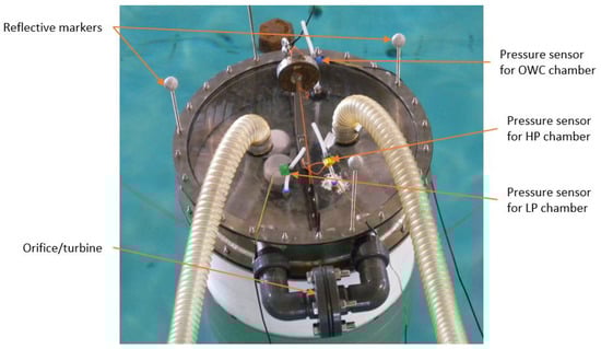 The devices were fully monitored using 3D cameras, pressure sensors, and wave probes, allowing the measurement of the devices’ motions, IWS elevation, pressure drops, and volumetric flow rates across orifices and valves. Wave probes located outside of the device measured the incoming wave elevation. A wave probe located inside the column of the device measured the relative elevation of the water column relative to the buoy. Figure 10 displays a picture of the device, from above, equipped with pressure sensors and reflective markers for the 3D cameras.