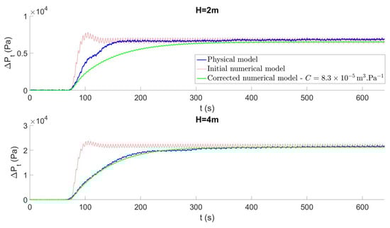 From an energy point of view, the pneumatic energy stored in the HP and LP chamber was not only stored in the form of pressure, but also under the form of strain energy. This explains the lower pressure variations between wave groups, and the average value of the pressure drop across the orifice was not impacted; see Figure 12. In the next section, only the corrected numerical model of the model-scale device accounting for the chambers’ deformation was used.