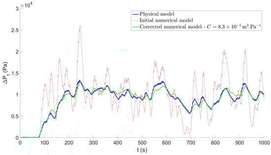 Pressure drop time series across Orifice 3 of the Tupperwave device obtained by the physical model, the initial numerical model, and the corrected model in the irregular sea state { m; s}.