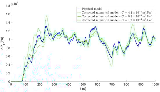 Pressure drop time series across Orifice 3 of the Tupperwave device obtained by the physical model and the corrected model in the irregular sea state { m; s} with different chamber stiffness values.