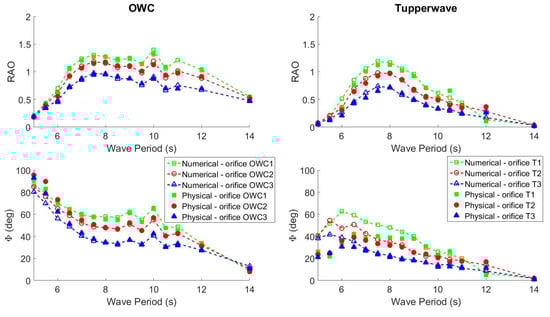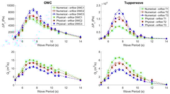 The average pressure drop and volumetric flow across the orifices in regular waves are compared in Figure 15. Good agreement was obtained between numerical and physical results. In both devices, the pressure drop decreased with increasing orifice diameter, and the flow across the orifice increased. The Tupperwave device produced larger pressure drops and lower flow rates across the turbine than the conventional OWC.