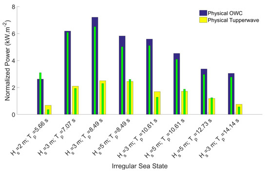 Figure 16 displays the average pneumatic power normalized by the significant wave height squared obtained numerically and physically by the two devices in the eight irregular sea states tested. Figure 17 displays the time series of the pneumatic power for the irregular sea state { m; s}. The two devices were equipped with their most efficient orifices (OWC2 and T2).