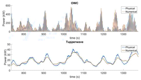Good overall agreement was obtained between physical and numerical results. The errors of the numerical models on average power prediction in irregular wave tests in Figure 16 were 10.1% for the conventional OWC and 16.5% for the Tupperwave device. The passive valves in the Tupperwave model are an additional component to model, and their fluctuating behaviour with the device excitation in irregular waves (see Section 3.1.3) is hence an additional source of error in numerical model fidelity.