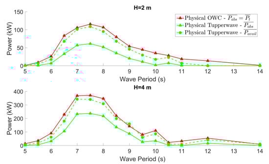 Figure 18 displays the average power absorbed by the device from the waves and the average pneumatic power available to the turbine in both devices in 2 and 4 m-high regular waves. In the case of the conventional OWC, the absorbed power is, on average, entirely made available to the turbine []. The Tupperwave device absorbed 4–20% less power from the waves than the conventional OWC for wave periods between 6 and 9.5 s. This is probably due to the stiffer coupling between the structure and the water column in the Tupperwave device, which prevented optimal absorption. Moreover, unlike in the conventional OWC, only about 60% of the absorbed wave power was made available to the turbine, and the rest was dissipated in the valves []. This reveals the poor efficiency of the valves used during the tests. In the end, the Tupperwave device produced on average only about 40% of the available pneumatic power produced by the conventional OWC device for wave periods between 6 and 9.5 s. This went down to 33% on average in irregular waves; see Figure 16. The efficiency of the Tupperwave device to convert the absorbed wave power into available power to the turbine was studied in greater detail in [].