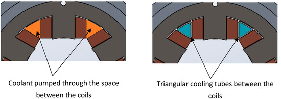 Another commonly used cooling method is the direct coil cooling [14,15,16], which is an effort to bring the coolant closer to the heat source. This type of cooling system is often achieved by pumping oil through the coils or by placing axial cooling tubes in the slot together with the coils, where a coolant flows through the tubes.