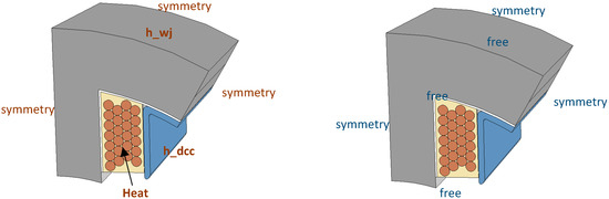 The water jacket and the direct coil cooling are modelled by using convective heat transfer coefficients, which are calculated as explained in Section 4. In the structural model, a symmetric boundary condition has been used on adjacent sides in the circumferential direction. Since only half of the axial length is used in the simulations, the back face of the geometry has also been modeled with a symmetric boundary, while the front face is free to move. The upper and lower face along the radial direction are also modeled as free to move. The geometry used in the study together with the boundary conditions used in both the thermal and mechanical simulations are more clearly illustrated figuratively in Figure 4.
