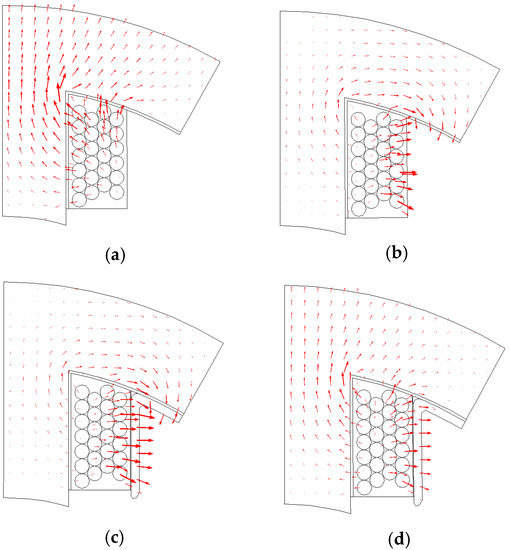 When the machine is cooled with the water-jacket, the heat from the coils flows to the tooth and the yoke of the machine and radially convects through the water jacket, as shown in Figure 5a. In case of direct coil cooling (Figure 5b,c), the coils close to the coolant dissipate heat directly, but a significant part of the generated heat conducts through the stator tooth to the yoke before finally convecting through the cooling tube. This results in higher temperatures in the stator tooth and yoke compared to the former case. In the case of combined water-jacket and direct coil cooling, the heat generated in the coil follows two paths resulting in lower temperatures in the overall domain.