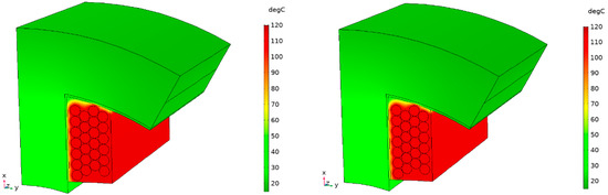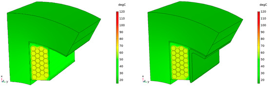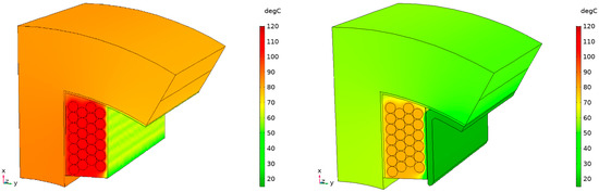 The temperature distributions obtained from the simulation of different cooling cases are shown in Figure 6, Figure 7 and Figure 8. For easy comparison, the color scale is set to the same range in all the figures. In Figure 6, the temperature distributions in the case of the two water-jacket configurations are shown. Even though the geometries of WJ1 and WJ2 are different, the heat flow and the convective heat-transfer coefficients do not differ much. Therefore, the distribution of the temperature in the overall volume is almost the same in both the cases. The maximum temperatures are also about the same with 115 °C in the coils in the case of WJ1 and 114 °C in the case of WJ2. The maximum temperature in the stator core is about 37 °C in both cases.