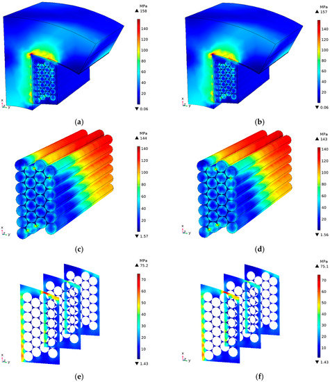 Figure 11 shows the stress distributions in the case of combined water jacket and direct coil cooling, WJ1 + DCC1 and WJ2 + DCC2. These cooling techniques resulted in the lowest temperature levels from the thermal simulations. Consequently, the stress levels are also comparatively lower than previous cases. Between the two cases of combined water jacket and direct coil cooling, the stresses in the copper wires and epoxy have similar a level of magnitude, with WJ2 + DCC2 having slightly higher values compared to WJ1 + DCC1.