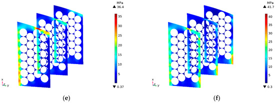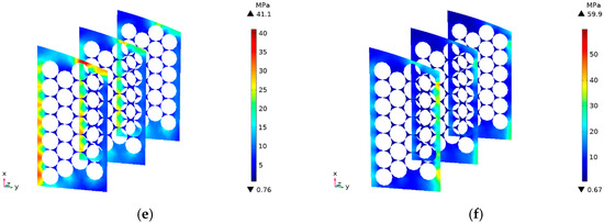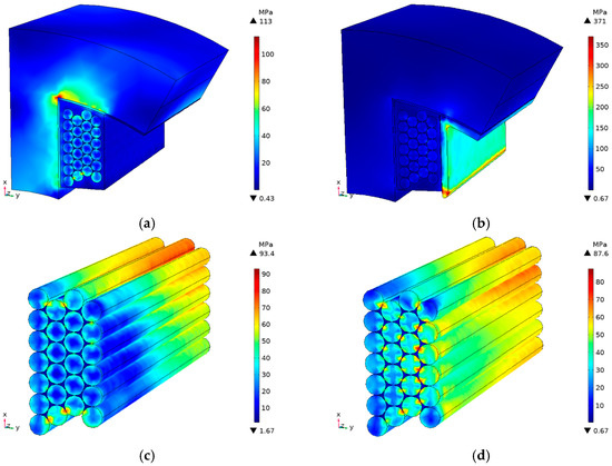The maximum stress occurs on the surface of the tooth in both the cases, but the stresses in the copper wires are also significantly higher. In both cases of water jacket cooling, the maximum stress occurring in the copper wires is about 144 MPa. This value is quite high especially if we think about the coatings of the copper wires. Usually, the wires are coated with polymers like Polyamide-imide, the tensile strength of which is about 250 MPa. The coefficient of thermal expansion of Polyamide-imide is about the same as copper. Therefore, the coatings will undergo similar stresses as the copper wires. Few cycles of such high stress could lead to the failure of the wire insulation. It can be seen from Figure 9c,d that most of the copper wires undergo high stresses. The relatively lower stress seen towards the front face is the result of the ‘free’ boundary condition imposed on that face. In addition, the lower sections of the wires have lower temperature gradients relative to the surrounding region. The average stress in the wires in both cases is about 87 MPa.