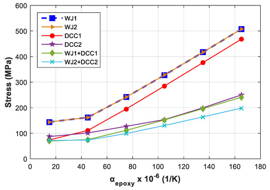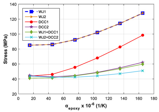 Maximum stress calculated in the copper wires as a function of the coefficient of thermal expansion of epoxy.