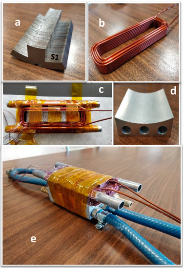 Construction of the segmented stator winding set-up used for the validation of the numerical results: (a) one tooth segment of the stator of a SR machine; (b) form coil used as the winding; (c) form coil placed on the tooth along with two triangular tubes for direct coil cooling, ready to be impregnated with epoxy resin; (d) water jacket for the set-up; (e) the epoxy impregnated segmented stator winding set-up together with the water jacket.