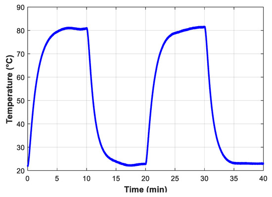 As the current is supplied in the copper wires, the temperature in the set-up starts to rise. At t = 10 min, the supply is switched off and the set-up is let to cool down. At t = 20 min, the supply is switched on again for another cycle. Figure 16 shows the temperature measured on the surface of the coil during the two cycles.