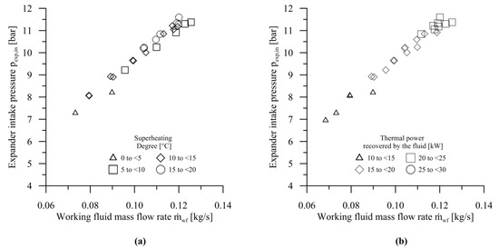 In Figure 2a the values of the expander intake pressure are reported as a function of the mass flow rate for different ranges of the working fluid superheating degree. As Figure 2a shows, the pressure was not influenced by this parameter, demonstrating a substantial linear behavior with mass flow rate. Indeed, if the mass flow rate varied between 0.070 kg/s and 0.125 kg/s, the intake pressure rose linearly within the range 7–12 bar, in despite of the working fluid superheating degree (between 0 °C and 20 °C). Therefore, the mass flow rate was the main driver that defines almost univocally the expander intake pressure. In order to ensure the specified superheating degree, the thermal power exchanged between exhaust gases and working fluid changes as it is reported in Figure 2b. In Table 4, some experimental cases of Figure 2 are reported in more detail. It can be noticed how the increase of intake pressure led to an enhancement of the mechanical power produced by the expander as the indicated power grows.