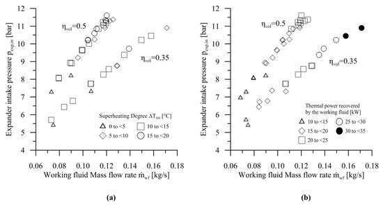 (a) Effect of the expander volumetric efficiency on intake pressure variation as a function of the mass flow rate for different values of superheating degree; and (b) effect of the expander volumetric efficiency on the thermal power recovered by the working fluid.
