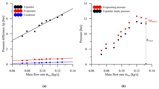 (a) Pressure drop across the evaporator, condenser, and expander varying the mass flow rate; and (b) evaporating and expander intake pressure varying the mass flow rate provided by the pump.