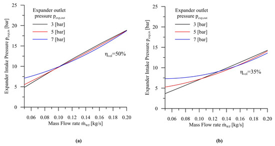 Expander intake pressure varying the mass flow rate provided by the pump and the expander outlet pressure when the expander volumetric efficiency is ηvol = 50% (a) and ηvol = 35% (b).