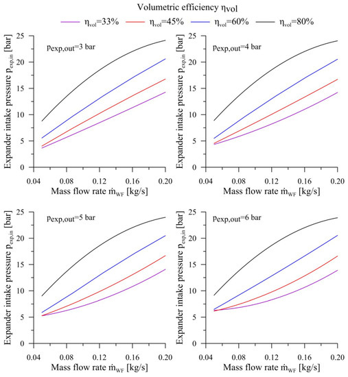 The maps reported in Figure 6 allow to evaluate if the expander is working according to the expected condition or if anomalies are taking place. The maps represent the intake pressure trend as a function of ṁWF provided by the pump for different values of volumetric efficiency of the expander. In order to consider also the effects of the condensing pressure on the intake pressure of the expander, a diagnostic map can be derived for several pexp,out. Therefore, entering the intake and exhaust pressure of the expander and the mass flow rate circulating inside the plant, the map detects if the expander is properly working. In fact, referring to Figure 6, once the pexp,out is known (by a measurement), the corresponding sub-map can be considered. From it, the evaluation of the expander volumetric efficiency can be univocally performed entering the intake pressure and mass flow rate measured.