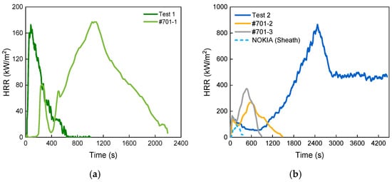 - The critical exposed radiative heat flux for the ZRC-YJV-8.7/10 3 × 95 mm2 power cable to achieve complete combustion lies in the range from 24.9 kW/m2 to 28.3 kW/m2. Compared with incomplete burning, its burning duration was more than four times longer and the peak HRR was five times as high (865.6 kW/m2). The incomplete burning was similar to the initial stage of the complete burning. Compared with other cables, i.e., NOKIA AHXCMK 10 kV 3 × 95/70 mm2 and 7/C #12AWG 600V, the ZRC-YJV-8.7/10 3 × 95 mm2 cable has a generally similar HRR/MLR evolving trend but with significantly greater hazard, even under a lower heat flux.
