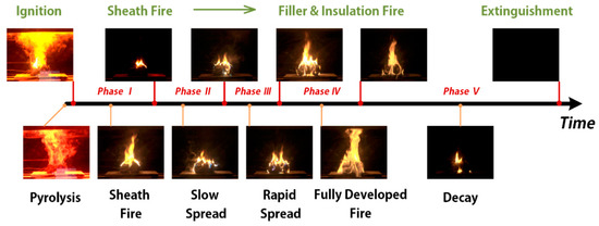 | II | Slow spread | 745–1374 s | The flame on the upper sheath was weak. Flashing under the upper sheath became unobtrusive. The sheath and insulation provided significant thermal protection. In the end, the flame started penetrating the underlying material and blue flames were noted. |