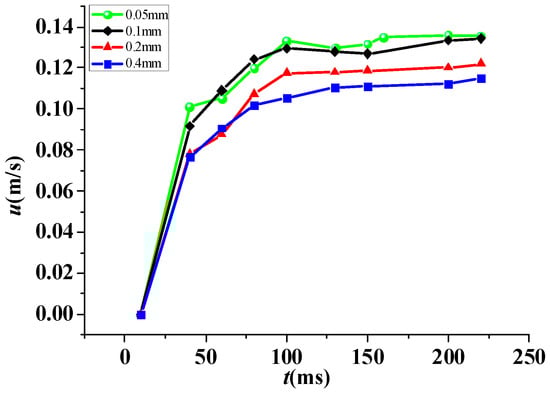 The effect of mesh size on simulation results was tested by simulating the rise of a single bubble with a diameter of 5 mm in stationary water. The grid resolutions tested were 0.05 mm, 0.1 mm, 0.2 mm, and 0.4 mm, respectively. The simulation results of bubble rising velocity with different mesh sizes are shown in Figure 1. It can be seen from the figure that the final stabilization velocity of bubbles was approximately the same with mesh sizes of 0.05 mm and 0.1 mm. Considering the accuracy and computing time, the mesh size of 0.1 mm and grid number of 4 × 105 were adopted in this study.
