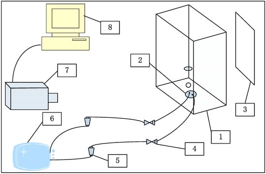 Experimental device and system: (1) water tank; (2) bubble generation module; (3) LED plane light source; (4) check valve; (5) float flow meter; (6) air pump; (7) high-speed camera; (8) computer.