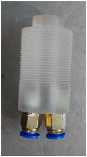 Figure 2 is a schematic diagram of the experimental system. The experimental device is composed of a water tank, bracket, float flow meter, LED plane light source, bubble generation module, check valve, air pump, high-speed camera, and computer. The visual water tank was a transparent container, which was made of organic glass. Its size was 300 mm × 300 mm × 300 mm, and the shoot direction size was 300 mm × 500 mm. It contained pure water with the height of 300 mm; inside orifices at the bottom of the tank were used to install the bubble generation component. Two orifices of the same diameter were drilled into the bubble generation component, as seen in Figure 3. The aperture outer diameter was 2 mm, and the distance, d, between two holes was 8 mm. The gas was provided by an electromagnetic vibrating air flow pump; in the experiment, a tiny flow glass rotor flow meter with a range of 16–160 mL/min was selected to control the gas flow into the gas orifice by adjusting the float flow meter. The formation process of bubbles was captured by a high-speed camera instrument.