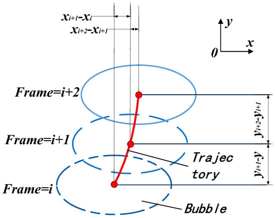 The size, velocity, and position of bubbles are key feature parameters in the transport process. During the experiment, the shooting speed of the high-speed camera was certain, and the time difference of each frame image was known. Therefore, the characteristic parameters of the bubbles could be obtained by comparing the position and size differences of bubbles in the two frames of images, and then the rising trajectories, detachment size, and velocity change regulation could be tracked.