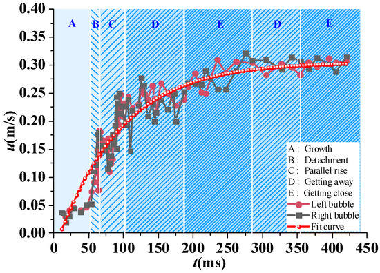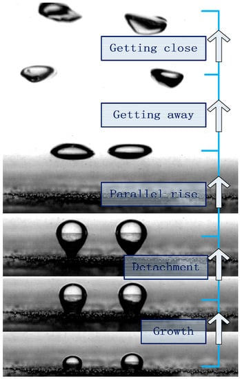 Under the condition that the orifice diameter was 2 mm, gas flow rate was 40 mL/min, and the orifice spacing was d = 8 mm; the rising process of bubbles was shot and tracked. Based on the change law of bubbles, the formation and movement process was divided into five stages (growth, detachment, parallel rise, getting away, and getting close), as shown in Figure 6.
