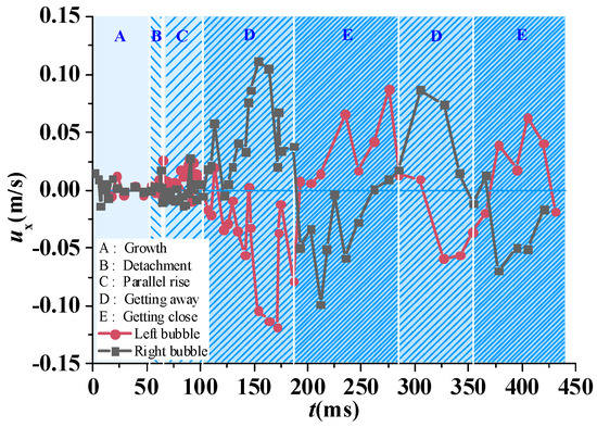 Figure 8 shows the lateral velocity variation law with time. As can be seen, the transverse velocity of the bubbles approximately represents simple harmonic oscillation: the bubbles always moved in the opposite direction. When the distance between the bubbles became smaller, they attempted to repel and move away from each other. The two bubbles changed their movement direction and velocity, and they approached after reaching the farthest distance.