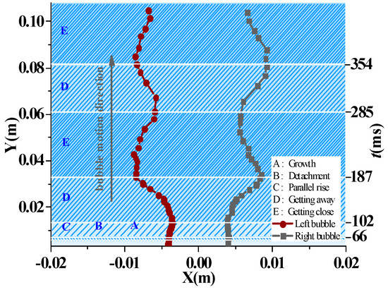Figure 12 shows the rising trajectory of bubbles obtained from simulation. As can be seen, the simulation results were in good agreement with bubbles’ movement tracks throughout the experiment, and there was a cycle of approaching, leaving, and then approaching. Furthermore, according to Figure 12, the minimum distance that bubbles reached at the approaching stage was greater than the previous one, and the maximum distance was larger than the previous one. Thereby, the bubbles were gradually separated when they were accompanied by a cycle of approaching, leaving, and then approaching.