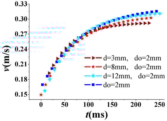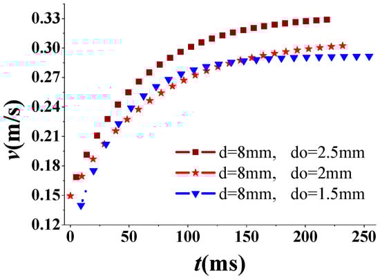 When orifice spacing was 8 mm, the bubble characteristics of different flow rates under three conditions (diameter of orifice: d = 3 mm, 8 mm and 12 mm) were studied through experiment. Moreover, the bubble size at detachment under the three conditions were extracted. Figure 11 shows the change law of bubble rising velocity with time under different hole sizes. It was found that the change trend of bubble velocity was the same as that described above, and when the gas flow rate and orifice spacing remained the same, the smaller the orifice size was, the smaller final stable velocity bubbles had. According to the Stokes’s theory, it can be seen that the final velocity of the bubble was related to the size of the bubble, the smaller the orifice size was, the smaller the bubble size would be, which would slow down the final velocity of the bubble.