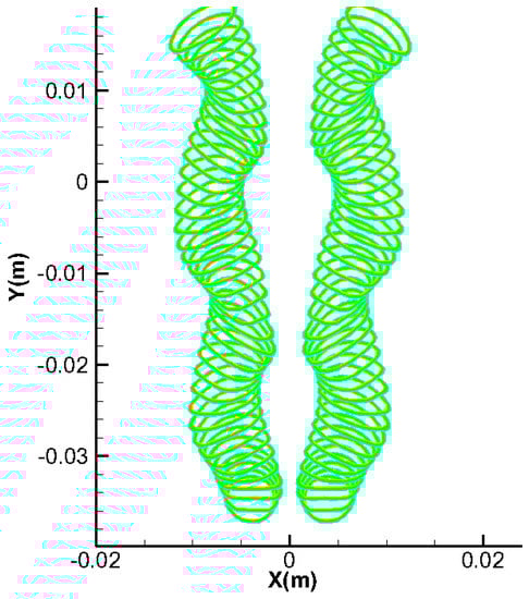 After the parallel rising stage, the rising trajectory of bubbles was not linear, but there was oscillation to left and right at the same time. A cycle of approaching, leaving, and then approaching occurred. Figure 9 shows the rising trajectory of the two bubbles.