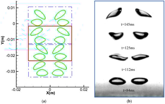 Figure 13a shows the change process of the relationship between the positions of the two bubbles obtained by simulation. The eight groups of data from bottom to top are the positions of the bubbles at time t = 0.05 s, 0.09 s, 0.13 s, 0.17 s, 0.21 s, 0.25 s, 0.29 s, and 0.33 s. Figure 13b shows the data of the shot image, and it shows the changes rule of the relative position and shape of two bubbles separated at the same time, with time in the rising process. It was found that the simulation results framed by solid line were consistent with the results observed in the experiment. The two bubbles presented the cycling phenomenon of “V” shape and inverted “V” shape in the rising process.