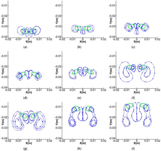 The Streamline shape and deformation process of two rising bubble. (a) t = 0.01 s; (b) t = 0.04 s; (c) t = 0.06 s; (d) t = 0.08 s; (e) t = 0.1 s; (f) t = 0.13 s; (g) t = 0.15 s; (h) t = 0.20 s; (i) t = 0.22 s.