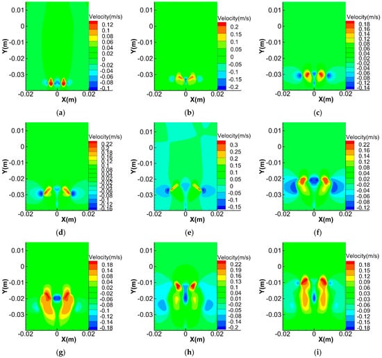 The velocity distribution of two rising bubbles. (a) t = 0.01 s; (b) t = 0.04 s; (c) t = 0.06 s; (d) t = 0.08 s; (e) t = 0.1 s; (f) t = 0.13 s; (g) t = 0.15 s; (h) t = 0.20 s; (i) t = 0.22 s.