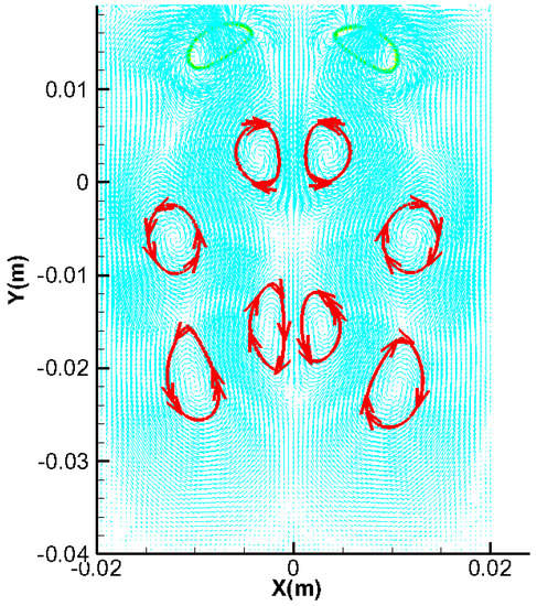 The unbalanced forces on the left and right part of the two bubbles in the rising process caused whirlpools in the surrounding fluid after bubble disturbance. Figure 16 shows the flow field structure in the pipeline when t = 0.4 s. The position relationship of bubbles went through two cycles within the period of 0.4 s, and two pairs of whirlpools were generated in each cycle.