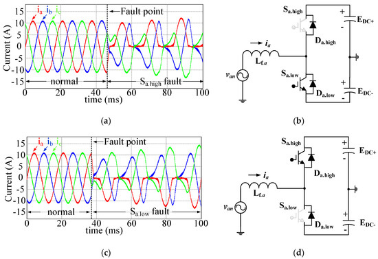 The phase current of the AC–DC converter before and after the switch fault is presented in Figure 2. If the high-side switch of the converter fails, the phase current of the negative side is not controlled, as shown in Figure 2a. In contrast, when the low-side switch fails, the positive current is uncontrolled, as shown in Figure 2c. According to the switch position, the equivalent circuits of the switch fault condition are presented in Figure 2b,d.