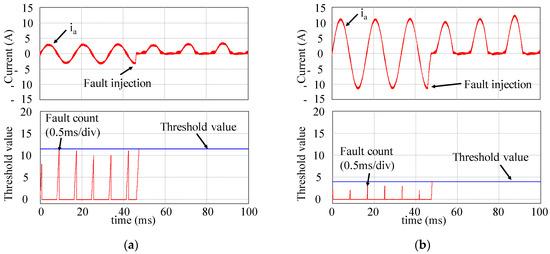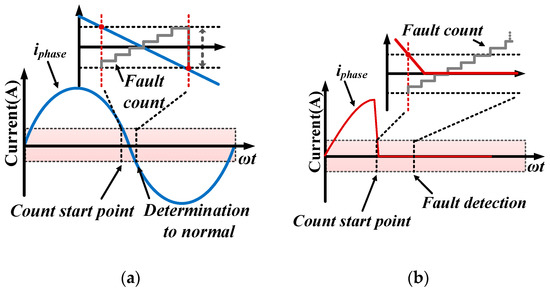 As shown in Figure 2, the phase current reaches zero in the zero crossing of the normal condition and the switch fault condition. Therefore, using this characteristic of the phase current in the switch fault condition, the faulty leg can be detected by obtaining the time difference of the phase current that is nearly zero between the switch normal condition and the switch fault condition, as shown in Figure 3. Under the switch normal condition, the fault counter operates for a short time, as shown in Figure 3a. Under the switch fault condition, as shown in Figure 3b, the fault counter is operated for a longer time compared with the switch normal condition. However, the threshold points for distinguishing between the switch normal condition and the fault condition are not clearly determined. In order to determine the switch fault using this method, it is necessary to set the threshold point to classify the fault count as a failure. If this threshold point is inaccurately determined, the following problems occur.