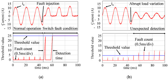 Using the proposed algorithm, the simulation is conducted as shown in Figure 8. In the simulation results, the switch fault can be detected by the proposed fault diagnosis algorithm using the variable threshold point in the full load condition. In particular, the fast fault diagnosis can be performed by the decreasing τ according to increasing the loads compared between Figure 9a,b.