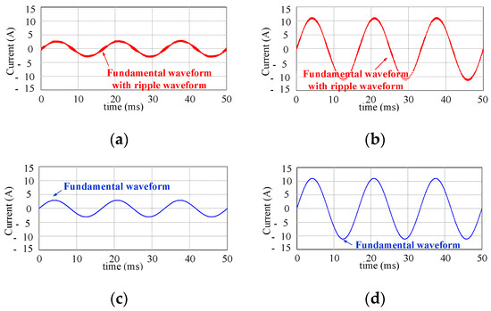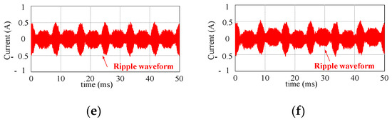 Phase current waveform in a grid-tied AC–DC converter: (a) phase current in the light load condition; (b) phase current in the full load condition; (c) fundamental current waveform in the light load condition; (d) fundamental current waveform in the full load condition; (e) ripple current waveform in the light load condition; (f) ripple current waveform in the full load condition.