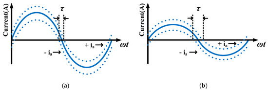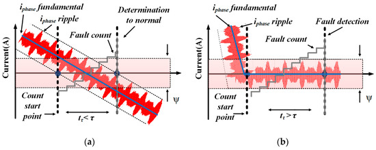 To determine the threshold point using the current ripple, the magnitude of the current ripple and the time the current remains nearly zero should be defined depending on whether this occurs before or after the switch fault. Figure 6a,b present a phase current considering the ripple on the AC–DC converter before and after the switch fault condition, respectively. In Figure 6, the switch fault is detected by ψ, which represents the magnitude of the current ripple, and τ, which represents the time during which the current was near zero. To calculate τ, the instantaneous phase current value that contains the maximum current ripple should be determined as (2). For considering the maximum current ripple, the harmonic current from switching is approximated using the filter damping ratio ζ in (2). It is difficult to obtain τ directly using (2); therefore, the maximum current ripple +ia and the minimum current ripple −ia are derived by approximating (2), as shown in (3) and (4), respectively. Finally, τ is calculated by the time difference when +ia and −ia are equal to zero, as shown in (5).