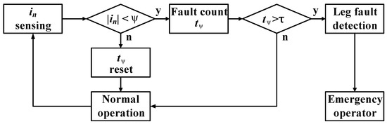 A flow chart explaining the proposed algorithm considering the above-mentioned operation principle is presented in Figure 7. In this flow chart, the fault counter is operated when each phase current is measured within ψ. If the counted time from counting the fault counter, which represents tψ, exceeds the τ, the faulty leg corresponding to the fault condition can be detected. The fault counter is reset when the phase current is no longer in the ψ region and before it reaches the τ region. In the counter reset case, the AC–DC converter is determined to be operating under normal conditions.