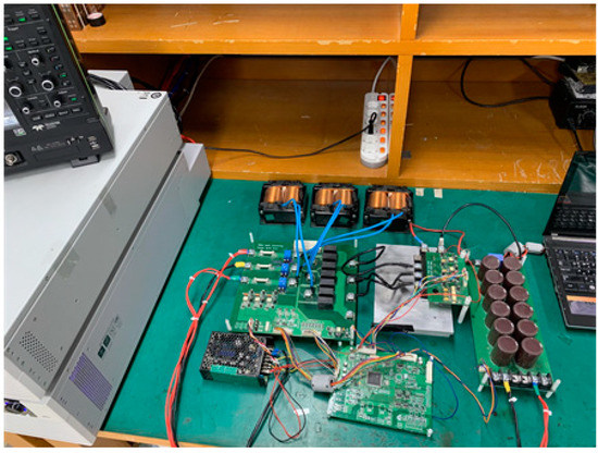 To verify the performance of the proposed diagnosis algorithm, experiments are conducted on a 3-kW prototype test bed, as shown in Figure 10. The parameters listed in Table 1 are used to design the converter and conduct the experiments. The switching frequency is selected to consider the frequency specifications and the losses of the applied IGBT. The filter inductor and the filter capacitor are designed for satisfying the THD standard. The DC link capacitor is constructed for demonstrating the DC grid. In order to exclude the influence of time delay on the fault signal injection and the fault diagnosis, the interruption time of the microcontroller is determined to be 100 µs. A module-type power semiconductor with three legs is used, as shown in Figure 10. To improve the objectivity of the experiment, the switch fault is demonstrated during the converter operation.