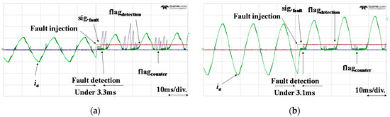 Figure 11 shows the waveforms obtained using the fault diagnosis algorithm according to the injected fault signals, which operate to stop the switch. Figure 11a,b show the proposed fault diagnosis waveform with a light load condition and a full load condition, respectively. The fault signal flag indicates the time of the fault situation. The fault detection flag means the time of the fault detection, which is obtained by the proposed algorithm. Before the fault occurs, the value of the fault counter is maintained under the threshold value. After the switch fault occurs, the fault counter exceeds the threshold value, and the switch fault is detected, as seen by the increase in the fault detection flag. The switch fault is detected within 4 ms, as shown in Figure 11a,b. Thus, using the proposed algorithm, switch fault diagnosis can be achieved within 4 ms.