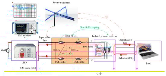 Switch-mode power supplies (SMPSs) have been widely used in both high power applications and low power applications. The flyback converter is one of the most commonly used topologies, especially in low power isolated converters such as mobile phone chargers, laptop power adapters, etc. Higher switching frequency and higher power density are the future development tendencies for isolated power converters, in order to achieve lower cost and smaller volume size. The efficiency, power density, and electromagnetic compatibility (EMC) are the key factors for power supplies, but they contradict each other. Since a higher switching frequency is helpful to achieve higher power density, it also brings many challenges in electromagnetic interference (EMI) issues. Figure 1 shows the propagation paths of electromagnetic interference noise in the isolated power converter. Generally, EMI noise can be categorized into conduction emission (CE), EMI noise, and radiation emission (RE) EMI noise. For radiation emission EMI noise, it will radiate electromagnetic energy into space, which will be received by the antenna. Then, the EMI receiver will display the noise spectrum of RE EMI noise. For conductive emission EMI noise, it can be further decoupled as different-mode (DM) noise and common-mode (CM) noise according to its propagation path. For DM noise, it will flow through L and N lines in the opposite direction. For CM noise, it will flow through L and N lines in the same direction to ground. The CM noise is harder to be suppressed compared to the DM noise because of its complex conduction paths influenced by stray inductive parameters and capacitive parameters. Besides, the generation and conduction mechanism of the CM noise is not well-known or well-modeled, especially in high-frequency ranges. The interwinding capacitance of the transformer and the parasitic capacitance between the drain of primary MOSFET and the ground are the main CM noise conduction paths [1]. Eliminating the CM noise flowing through transformer coupling path can significantly lower the whole CM noise level of the converter, which is helpful to pass the EMI standard limited lines EN55022 class B [2]. Besides, magnetic components, such as CM chock, DM chock, and transformer, also exhibit leakage of magnetic flux, which will cause near-field coupling and worsen the filtering effect of the EMI filter [3].