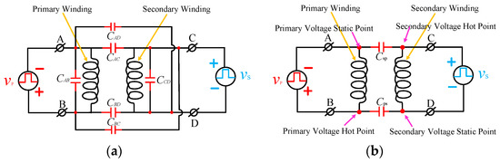 In a flyback topology, the winding connection is shown in Figure 2a. Points B and C are voltage hot points, which are connected to the primary MOSFET and the secondary diode, respectively. Points A and D are voltage static points, which are connected to the primary ground and the secondary ground, respectively. Because points A and D will not generate dv/dt, the expression (1) can be further simplified as (2):