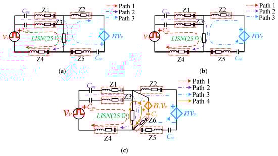 Figure 4a–c shows the transformer winding structure with the different winding arrangements. Various kinds of winding arrangements are proposed in previous references for some particular considerations. For instance, the transformer with interleaved winding structure can afford the minimal winding loss at the cost of large interwinding capacitance, which will worsen EMI characteristic. The transformer with PS ( primary secondary) winding structure can lower the EMI characteristic but this action will sacrifice the efficiency of the converter. For calculating the CM displacement current flowing through the inerwinding capacitance of the transformer, it should be noticed that only the displacement current flowing through the adjacent primary and secondary winding can be called CM noise current. Hence, the following will introduce the basic method of calculating the displacement current flowing through transformer coupling path under different winding arrangements.