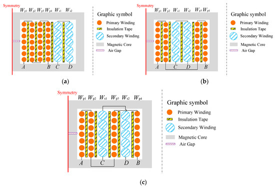 Winding structure. (a) PS winding structure. (b) Sandwitch winding structure. (c) Interleaved winding structure.